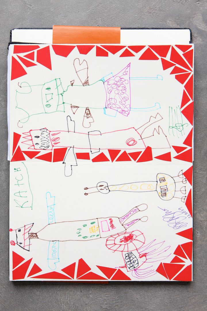 Thanks to good ol' JAY (Jay) for sending this wonderfully original collaboration--with a four-year-old! They knocked this little ditty out with colored pens and recycled stickers (great choice!!) JAY resides in the Philippines, and just mailed this out to michael in Virginia, USA--the book travels around the world!